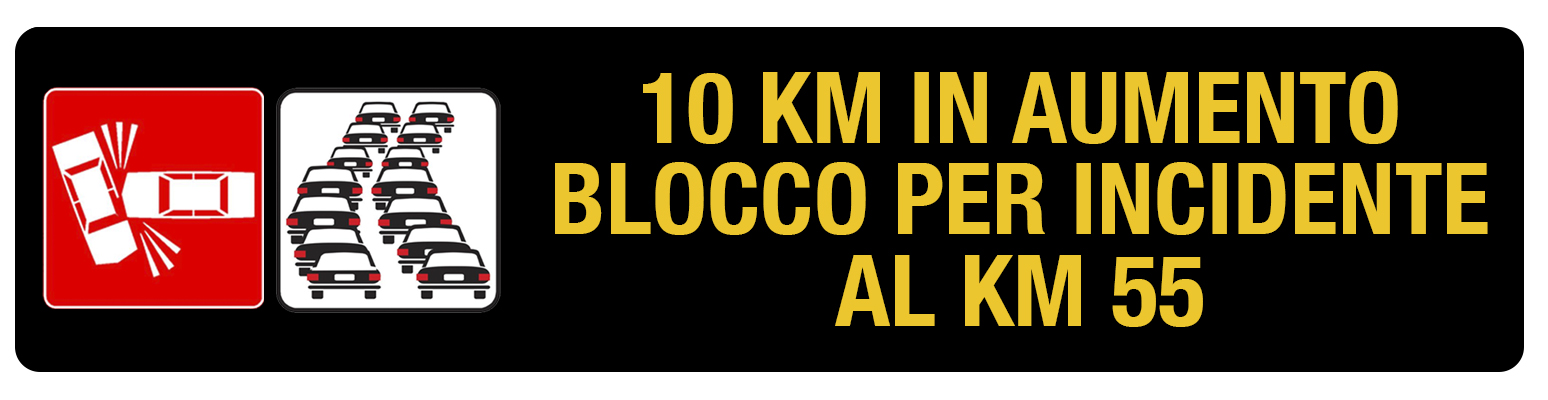 Indica la presenza di una coda di 10 km tendente ad aumentare, con traffico bloccato, causata da un incidente avvenuto al km 55.