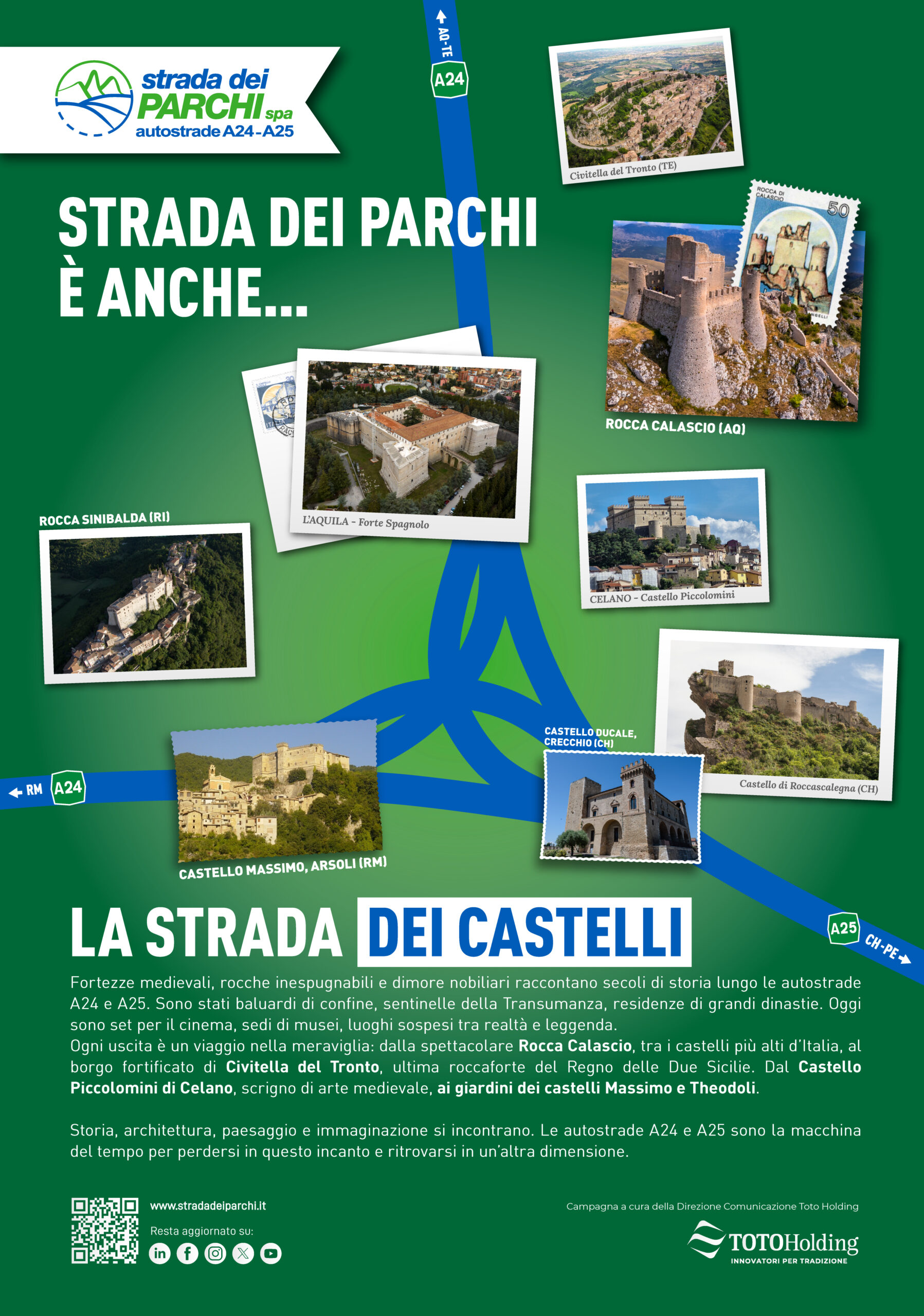 queste affascinati architetture sono ben visibili dalle autostrade A24 e A25, le accompagnano lungo tutto il tracciato. Ma il motivo più profondo è un altro: fortificazioni e manieri sono tra i simboli identitari più potenti di queste terre, luoghi che per secoli sono stati confine, frontiera, cerniera. Qui si sono affrontati Svevi e Angioini, Aragonesi e feudatari congiurati, qui sono entrati gli eserciti d’oltralpe, predoni saraceni e pirati ottomani, e si sono scontrati grandi capitani di ventura; qui sono passati tratturi, greggi, mercanti e culture, facendo di questi territori un ponte fecondo tra il Mezzogiorno del latifondo e le prospere economie comunali del Centro Italia. I castelli hanno difeso, vigilato, ma anche accolto: sono stati presidi militari, centri di scambio economico, piccole corti rinascimentali, luoghi di delizia e oggi, in molti casi, restano spazi culturali vivi, animati da eventi, musei, produzioni cinematografiche. Con questa serie, nell’anno di L’Aquila Capitale italiana della Cultura, vogliamo accompagnarvi in un viaggio che è insieme storico e turistico, nella bellezza e nell’identità di un territorio che abbiamo il privilegio di attraversare e collegare ogni giorno. Un viaggio che vi accompagnerà anche sulle autostrade, con una grafica dedicata in alcune Aree di Servizio.