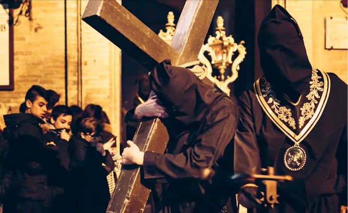Il Venerdì Santo prevede due riti: al mattino la Processione degli Incappucciati per la visita ai sepolcri; la sera la Processione del Cristo Morto scandita dal Miserere.