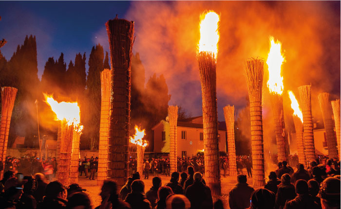 Le farchie sono colonne di canne alte fino a 10 metri che le contrade innalzano e accendono la sera del 16 gennaio, dando vita a una “foresta” di fuoco che rievoca il “miracolo” del 1799, quando il Santo invocato scoraggiò un’invasione del paese da parte dell’esercito dei rivoluzionari francesi. Nel 2026 l’accensione è prevista alle 17:00 e, per l’Anno Giubilare, si svolge in località Colle Selva: un colpo d’occhio unico, con musica, comunità e sapori condivisi.