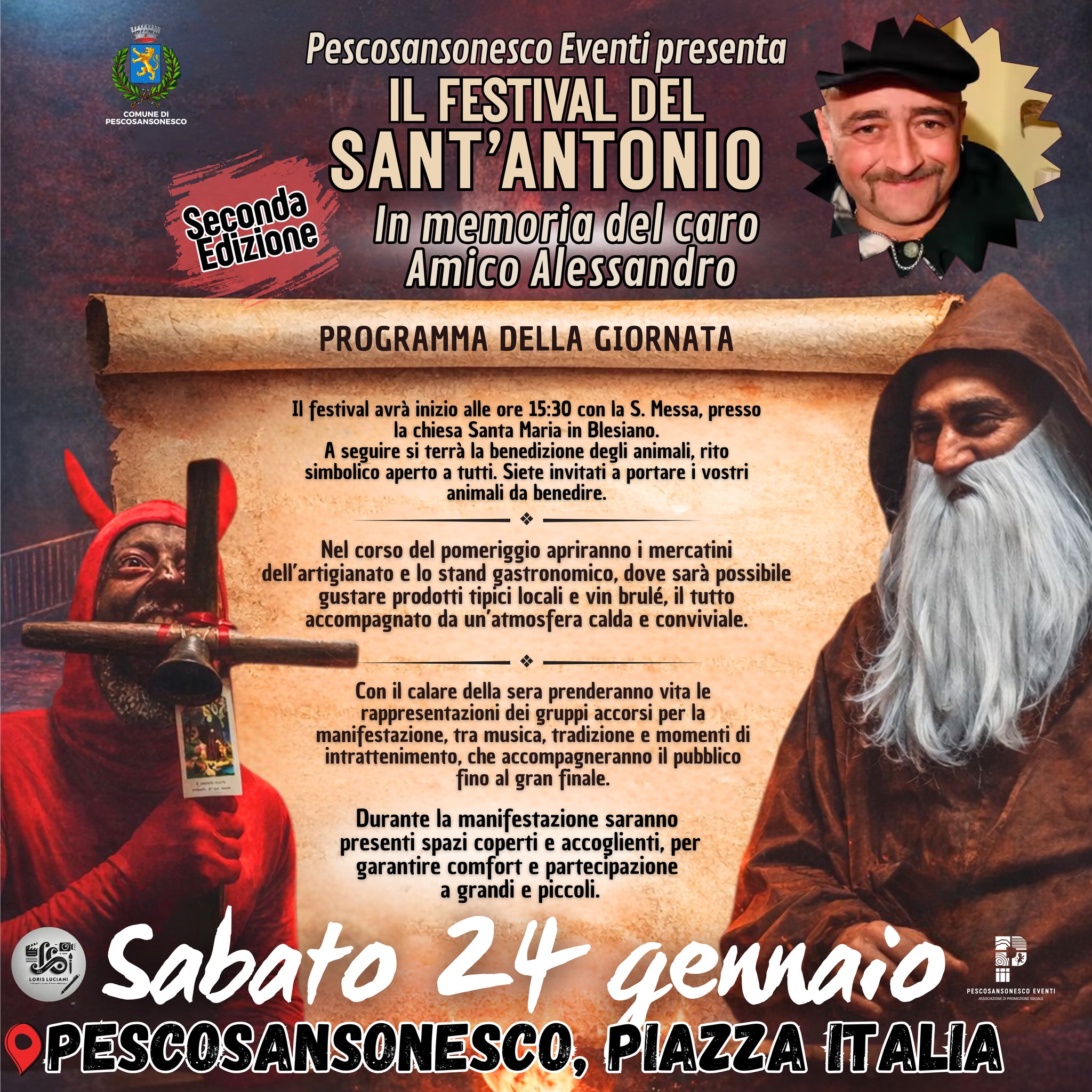 Alcune comunità abruzzesi programmano eventi anche nel fine settimana successivo: a Pescosansonesco la seconda edizione del Festival di Sant’Antonio è fissata per sabato 24 gennaio 2026. Il festival è caratterizzato dall’esibizione dei Santantonieri, gruppo storico della regione che suona il “charrasco”, noto nel paese di Pescosansonesco con il nome di sceta vaiasse (sveglia vacche).