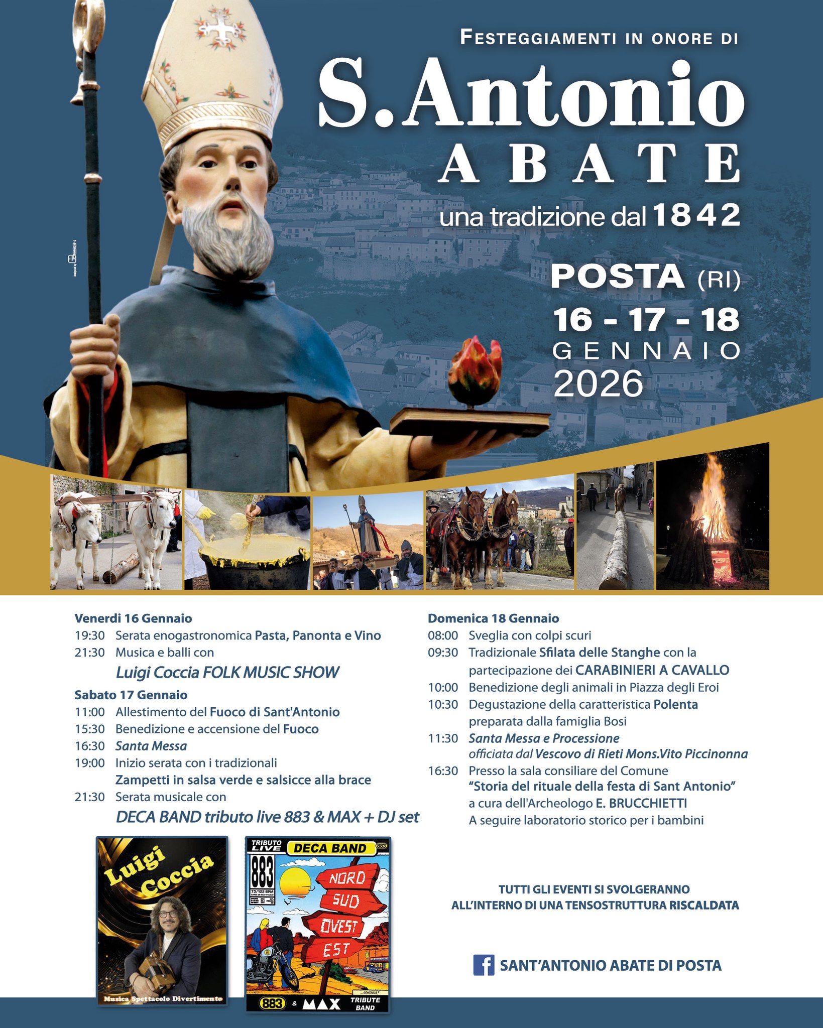Nel Reatino, Posta rinnova l’antico rito delle stanghe: tronchi trascinati in corteo da buoi o cavalli, fuoco in piazza, polenta e zampitti (stinchi di maiale), con liturgie e benedizione degli animali. La festa, legata alla Confraternita dell’Ottocento, si concentra attorno al 17 gennaio (o nel weekend successivo).