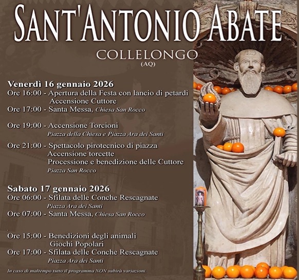 A Collelongo, nella Marsica, la festa si trasforma in un rito che coinvolge l’intero paese da oltre quattro secoli. La sera del 16 gennaio si accendono i torcioni—grandi torce di quercia alte più di cinque metri—mentre in alcune case si aprono le cuttore, con i caldai di rame in cui bollono i cicerocchi (granturco) offerti agli avventori. La notte è scandita da canti e dalla benedizione delle cuttore da parte del parroco. All’alba del 17 sfilano le conche rescagnate portate sul capo dalle ragazze in costume; nel pomeriggio la benedizione degli animali chiude la festa. Il Comune di Collelongo è uno dei 22 firmatari del protocollo d’intesa proposto dal Comune di Agnone e volto a creare una rete dei riti del fuoco con l’obiettivo di puntare al riconoscimento Unesco.
