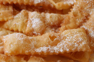 Nel Lazio sono d’obbligo le frappe, sottili sfoglie fritte e zuccherate, o le castagnole, una sorta di morbide palline fritte, talvolta ripiene di ricotta o crema. In Abruzzo, dove le frappe si chiamano chiacchiere o cioffe, regna su tutti la cicerchiata, un dolce composto da numerose palline di impasto, fritte con farina, uova, zucchero e olio, unite insieme con miele caldo, e decorate da confettini colorati (i diavoletti). Si possono inoltre assaggiare gli sgaiozzi, le frittelle di vino cotto e scorza d’arancia, le ciambelline di patate fritte, Li Cumplimente o le classiche ferratelle che, a seconda della località, assumono anche il nome di neole o pizzelle.