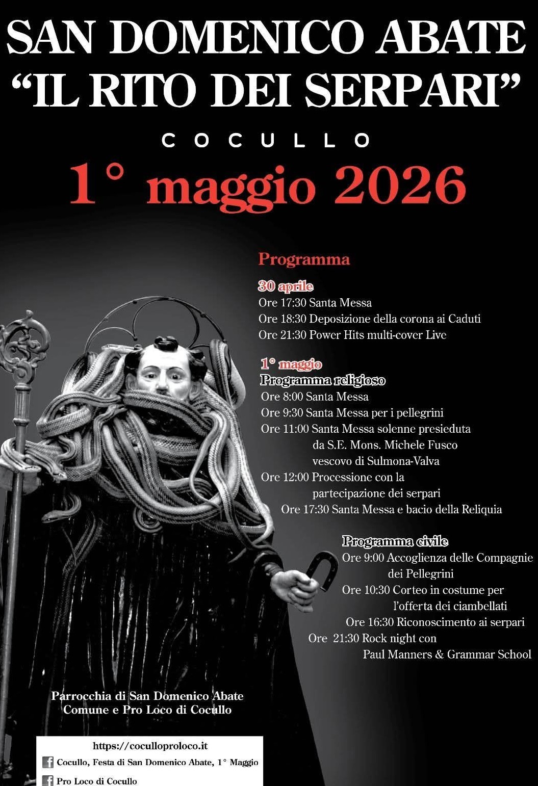 Il cuore della manifestazione sarà venerdì 1° maggio, con la Messa solenne celebrata dal Vescovo di Sulmona-Valva, S. E. Mons. Michele Fusco, seguita dalla processione dei Serpari.