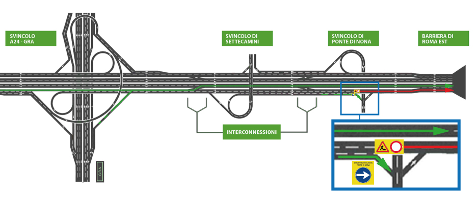 Conseguentemente, fino al 24 ottobre p.v., per i veicoli provenienti dalla Complanare Est in uscita da Roma è stata disposta un’uscita obbligatoria presso lo Svincolo di Ponte di Nona; il traffico proveniente dal GRA/Tangenziale Est, e diretto verso la Barriera di Roma Est/Lunghezza, potrà usufruire della carreggiata centrale dell’autostrada A24 e potrà accedere dalla Complanare Est dopo lo svincolo del GRA al km 1+000 mentre il traffico proveniente dalla viabilità ordinaria di Ponte di Nona e diretto verso L’Aquila/Teramo/A25 potrà accedere all’autostrada A24 tramite la Barriera di Roma Est percorrendo Via Collatina e Via di Lunghezzina.